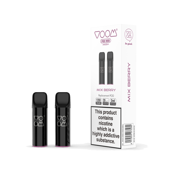 These 20mg Voom Pod Mod Replacement Mesh Pods are for the 20mg Voom Pod Mod Starter Vape Kit. They come in a pack of 2 pods, both in the same flavour. They are all pre-filled non-refillable 2ml pods that are available in 13 delightful colours and premium flavours. Each will last up to around 600 puffs. Each Voom Pod has a built-in mesh coil with 1.2Ω resistance delivers pure tasting flavour and abundant vapour with each puff you take that all adds to a good throat feeling.